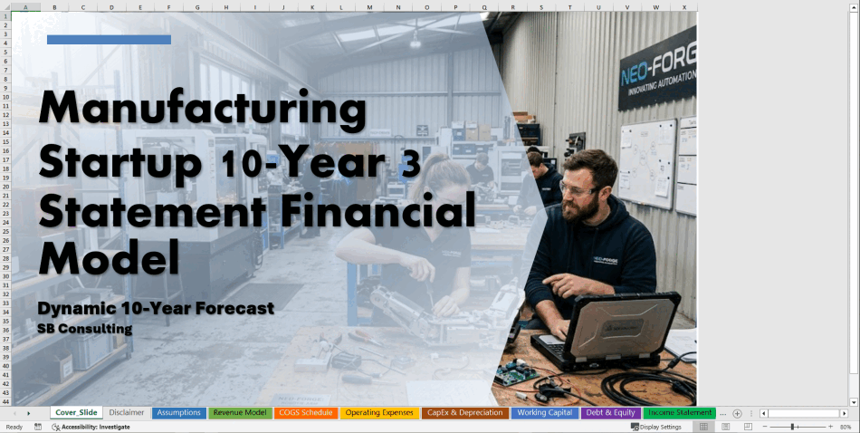 The Manufacturing Startup Financial Model is a fully integrated 10-year financial forecasting Excel workbook built specifically for manufacturing companies, production businesses, and industrial startups.