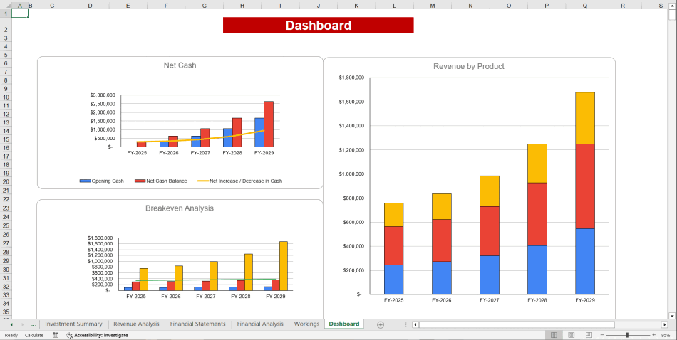 This financial model template contains inputs that, when changed, impact the calculations; therefore, the changes are applied to all relevant sheets. This financial model always has built-in flexibility to display different outcomes or final calculations based on this sheet's changes.