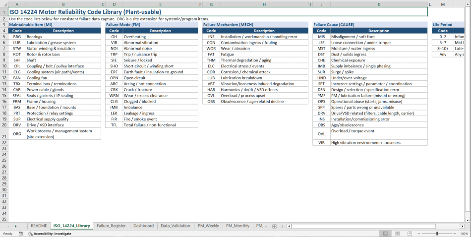 Source: Best Practices in Reliability Centered Maintenance, ISO 14224 Excel: Motor Reliability ISO 14224 Master PM Dashboard Excel (XLSX) Spreadsheet, Virtuoso Trading