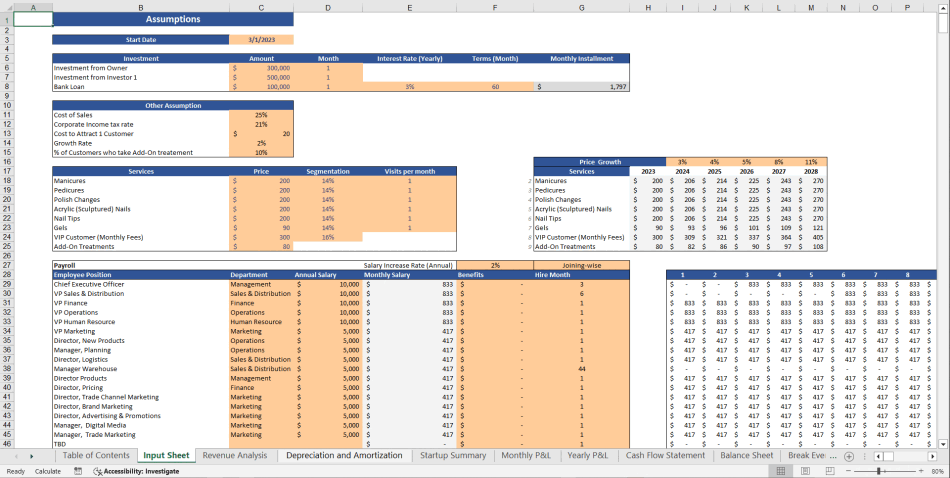 3. Financial Statements: The model includes a full income statement, cash flow statement, and balance sheet so you can keep an eye on your profits, monitor expenses, and make sure your salon stays financially healthy.
