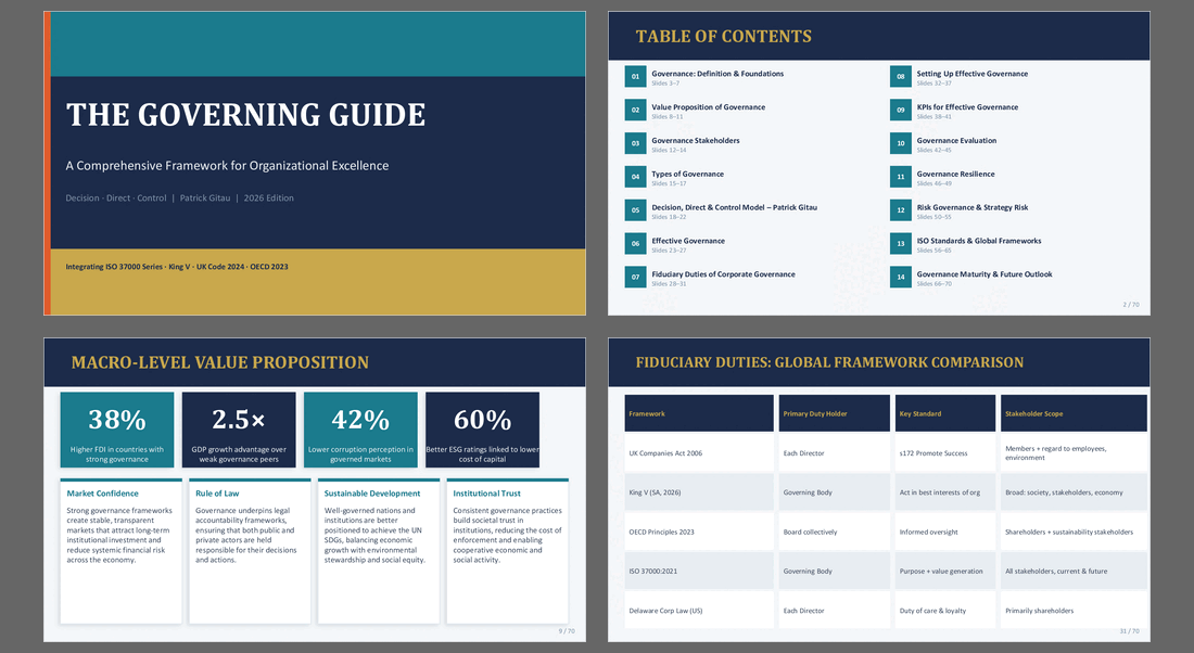 The Governing Guide by Patrick Gitau is a practitioner's response to this governance deficit. This 100-page reference manual integrates global governance codes and leading international standards into a single, operational framework for directors, company secretaries and senior executives. At its core is the Decision, Direct and Control (DDC) Model – a three-pillar architecture asserting that effective governing bodies must decide strategically, direct with clarity and control with independence and rigour.