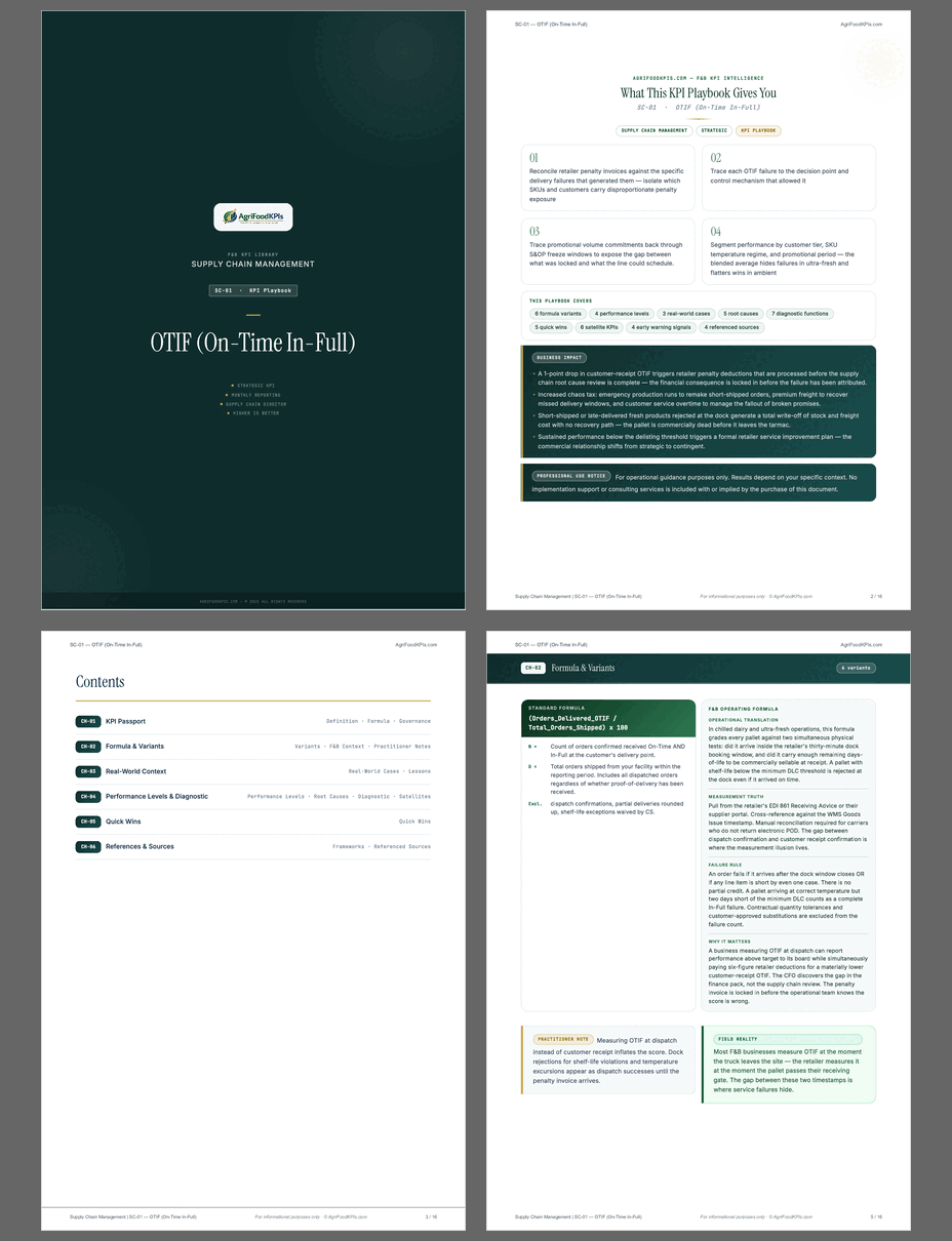 This playbook is a decision-oriented reference for Supply Chain, Commercial, Operations, Finance, and Logistics professionals in Food & Beverage. It explains how OTIF works in environments shaped by dock booking discipline, freshness pressure, promotional volume spikes, and the execution gap between commercial commitments and production reality.