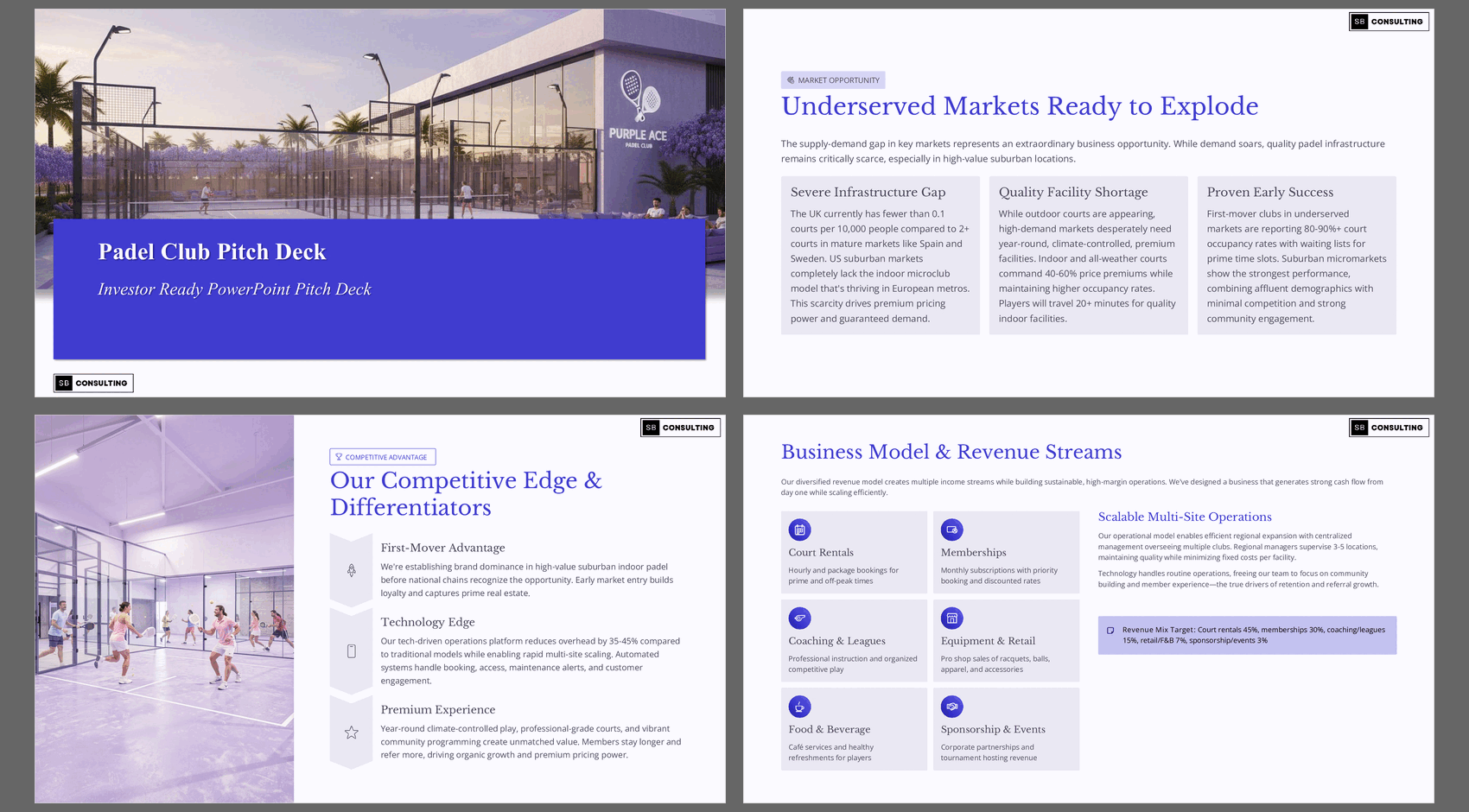 Stand out from the competition. Highlight your differentiators, innovative features, and strategic advantages that ensure your padel club dominates the local and global market.