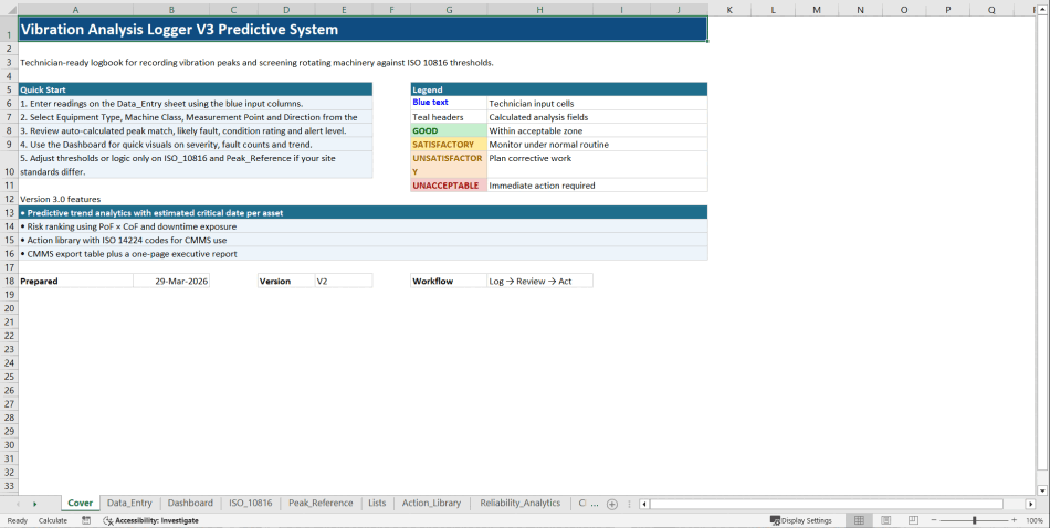 The Predictive Vibration Intelligence System (V3) is a professional-grade Excel toolkit designed for reliability engineers, maintenance teams, and industrial consultants who need to move beyond basic vibration logging and into true predictive maintenance.
