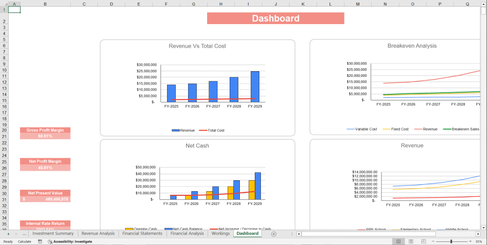 This financial model is like a navigator for your school's financial position. You just have to input the numbers, and it shows where you're headed. Whether you're forecasting revenue, analyzing operating costs, or balancing accounts payable, the model brings clarity and control. It's especially handy for business owners who want to create business plans or analyze financial statements like the balance sheet and income statement without hiring a full time corporate finance professional.
