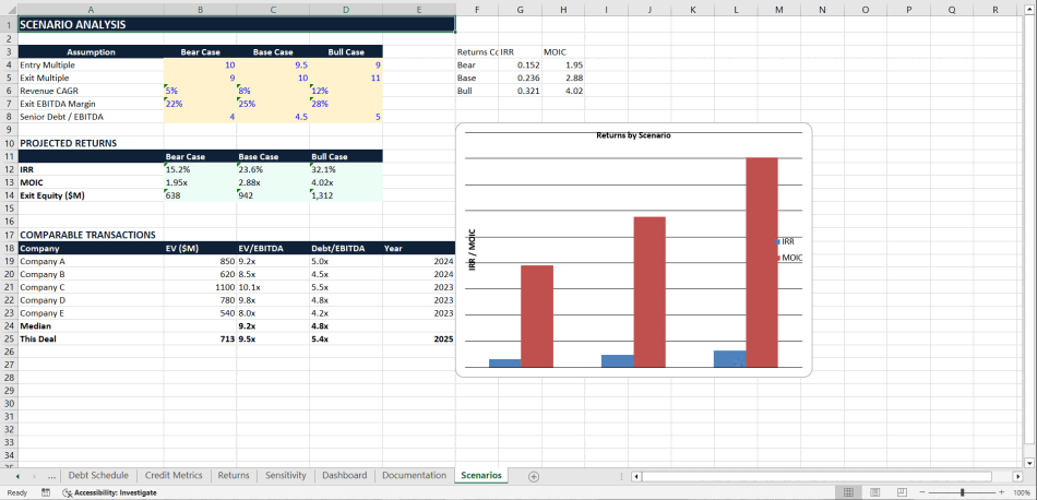 Instead of rebuilding an LBO from scratch, this workbook gives you a structured model where the core mechanics are already linked: transaction inputs → operating performance → debt paydown → returns. The layout emphasizes clarity (inputs vs formulas) so you can adapt it quickly to different companies, leverage levels, and exit assumptions.