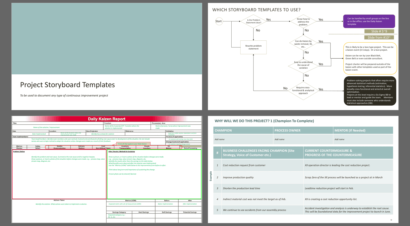Standard Storyboard templates are used to record the story of a project as it works through the improvement process. There are many different ways to present the story of a project. How you will present will depend upon the type of project that has been worked.