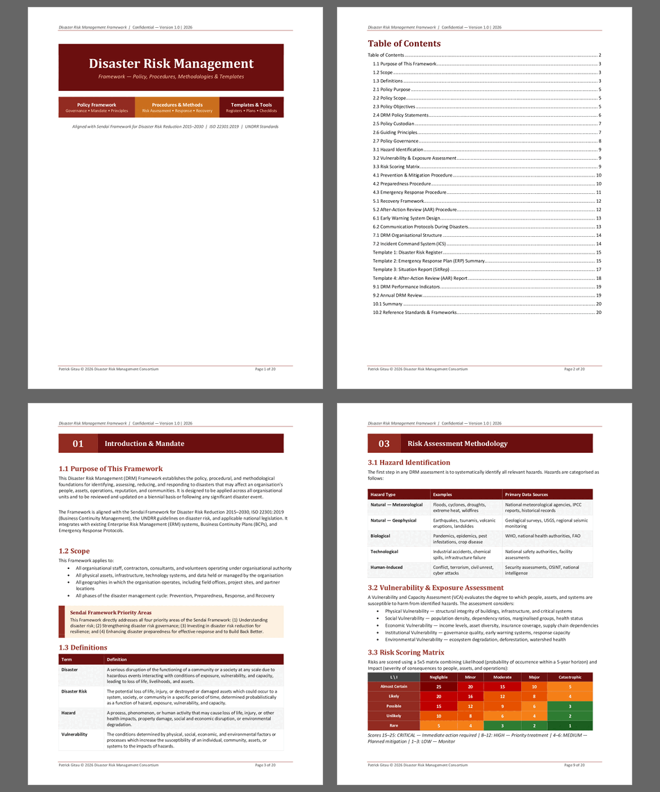The Disaster Risk Management Framework is a comprehensive, standards-aligned toolkit built for organisations that refuse to leave resilience to chance. Grounded in the Sendai Framework for Disaster Risk Reduction 2015–2030, ISO 22301:2019, and ISO 31000:2018, this Framework gives you everything you need to move from reactive crisis management to proactive, intelligence-driven resilience – immediately.