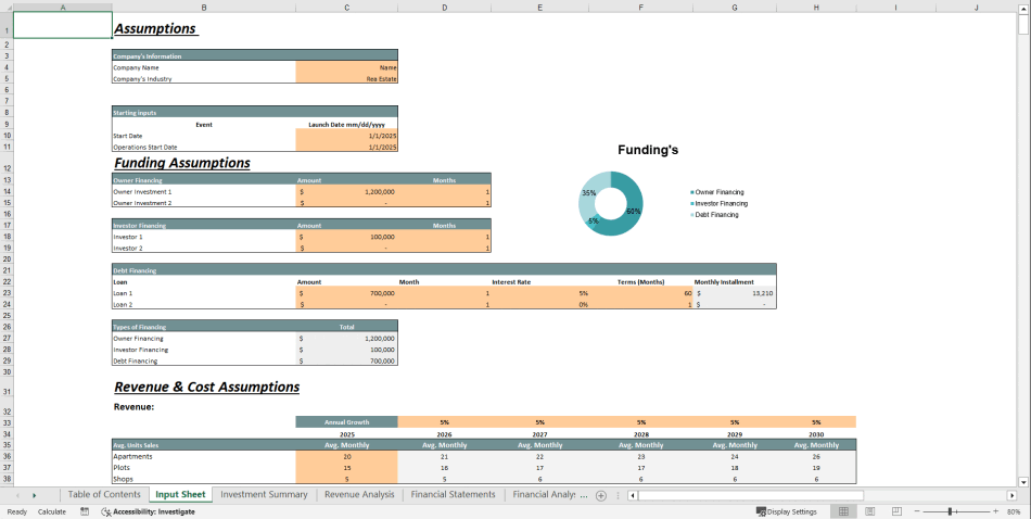 This Financial Model For Real Estate is highly adaptable and dynamic for forming a 5-year monthly and yearly 3-statement (Income Statement, Balance Sheet, and Cashflow Statement) financial projection for a startup or existing developer. This model also consolidates a discounted cash flow valuation calculation by using the projected Free Cash Flows. This Financial Model For Real Estate also calculates the main relevant financial performance ratios and KPIs required by banks and investors to estimate business profitability and liquidity.