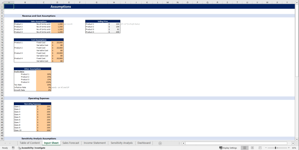 The dashboard provides a visual appeal to the financial model, presenting key insights through charts and graphs. This section helps stakeholders quickly understand how changes in assumptions affect financial outcomes.