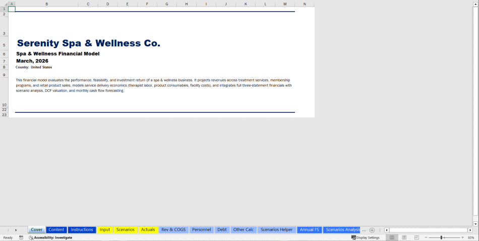 This comprehensive, fully integrated financial model evaluates the feasibility, operational scalability, and investment return of a Spa and Wellness Center. Built using financial modeling best practices, it provides a dynamic 10-year planning horizon covering diverse revenue streams including individual treatments, retail product sales, and recurring membership packages. Whether you are securing funding for a new build-out, managing a growing day spa, or analyzing strategic pivots for a medical spa, this model delivers clear, investor-ready insights through automated three-statement financials, DCF valuation, and visual performance dashboards.