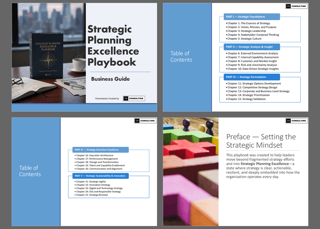 The Strategic Planning Excellence Playbook is a 400+ slide, executive-ready PowerPoint system designed to help CEOs, founders, consultants, strategy teams, and business leaders build, refine, communicate, and execute world-class strategy – without wasting months reinventing frameworks.