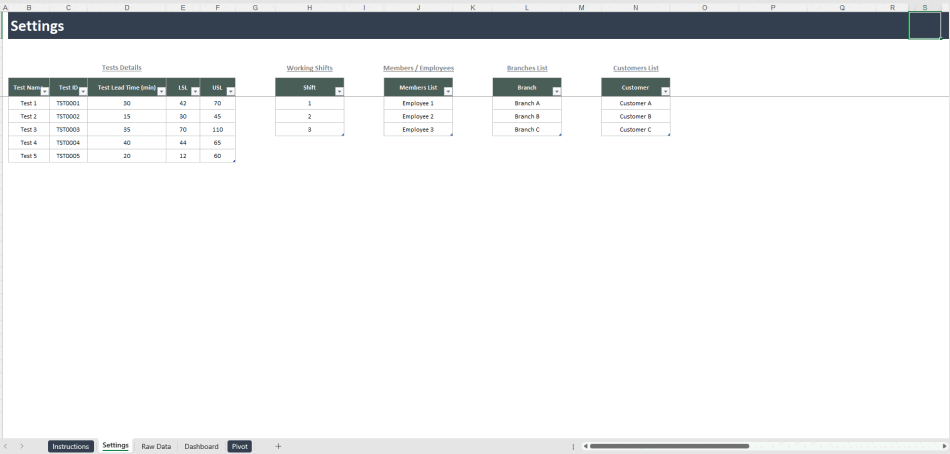 This sheet is used to configure all reference data required for the template. Once you update it, these settings will automatically populate tables and drop-down lists throughout the template.