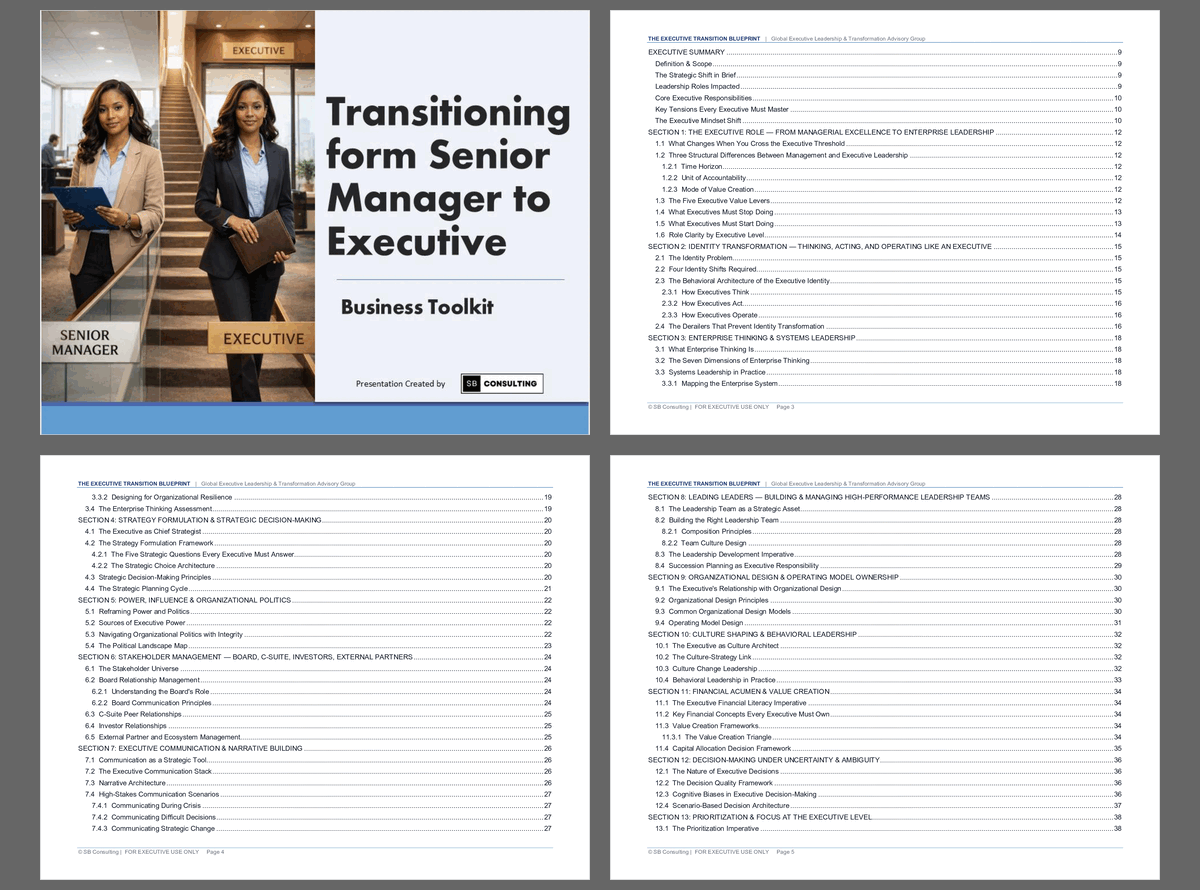 The Transitioning from Senior Manager to Executive Blueprint is a complete, step-by-step executive transformation system designed for high-performing leaders ready to: