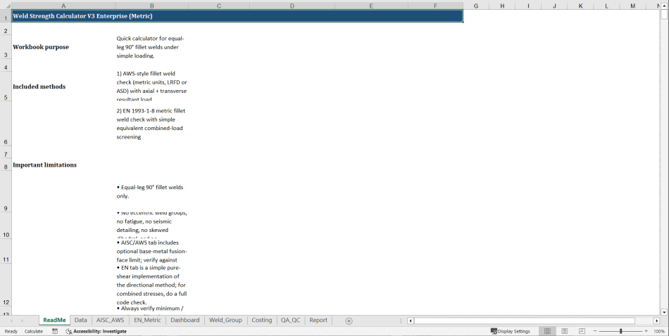 The Weld Strength Calculator V3 Enterprise is a professional-grade, metric-based engineering toolkit designed to support accurate weld design, failure analysis, and fabrication decision-making in industrial environments. Built for engineers, technicians, and maintenance professionals, this Excel-based system goes beyond simple calculations by combining strength verification, failure mode identification, costing, and quality control into one integrated solution.