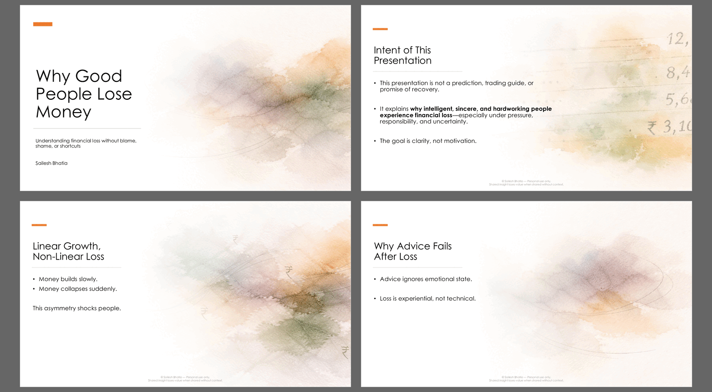 This is not a motivational document, a trading guide, or a financial planning manual. It is a thinking-oriented presentation, written in plain language, intended to slow the reader down and restore perspective.